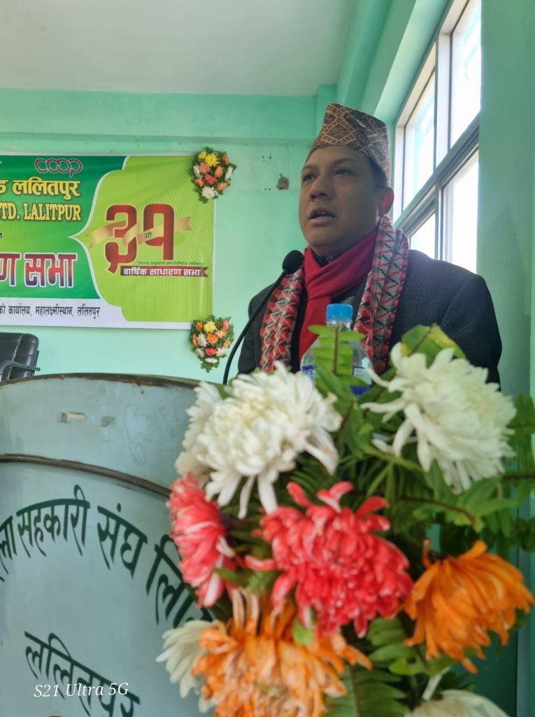 उहाँले ललितपुर जिल्ला भरीका सम्पूर्ण सहकारी संघ/संस्थाहरुको अभिभावक संघको रुपमा रहेको जिल्ला सहकारी संघ लि.,ललितपुरको भूमिका महत्वपूर्ण हुने भन्दै यस संघको तर्फबाट सहकारी संघ/संस्थामा तरलताको अवस्थामा देखा परेका समस्याहरु तथा भविष्यमा हुन सक्ने जोखिम बारेको समस्या समाधानको लागि यसै संघको नेतृत्वमा ललितपुर जिल्ला स्तरीय संयन्त्र निर्माण गरिएको बताउनुभयो । उहाँले जिल्ला सहकारी संघ लि., ललितपुरको गतिविधि र भावी योजनाको बारेमा प्रकाश पार्दै ‘सहकारी बीचको एकता , समग्र सहकारी अभियानमा पारेको प्रभाव , सरोकारवाला निकाय बीचको सम्बन्ध , बेला-बेलामा सहकारीमा देखिने अन्यौलको समाधान एवं सहकारी मैत्री बहस पैरवीमा अग्रणी भूमिका ललितपुरका सहकारी संघ/संस्थाहरुको विशेषता भएकोले ललितपुर जिल्ला सहकारी अभियानमा आफ्नो छुट्टै विशेषता एवं पहिचान बोकेको जिल्ल हो’, भन्नुभयो । सहकारी ऐन,२०७४ र सहकारी नियमावली ,२०७५ का केही बुँदामा सहकारी अभियानको असहमती रहेतापनि समग्र सहकारी ऐन र नियमावलीले सहकारी अभियानको विकास र प्रवर्द्धनमा महत्वपूर्ण भूमिका खेल्ने विश्वास व्यक्त गर्दै उहाँले ऐन र नियमावलीका सहकारीको विकास र प्रवर्द्धनमा बाधक प्रावधान संशोधन गरी यो ऐन र नियमावलीलाई पूर्ण रुपमा कार्यान्वयन गर्नु पर्ने खाँचो औंल्याउनुभयो ।