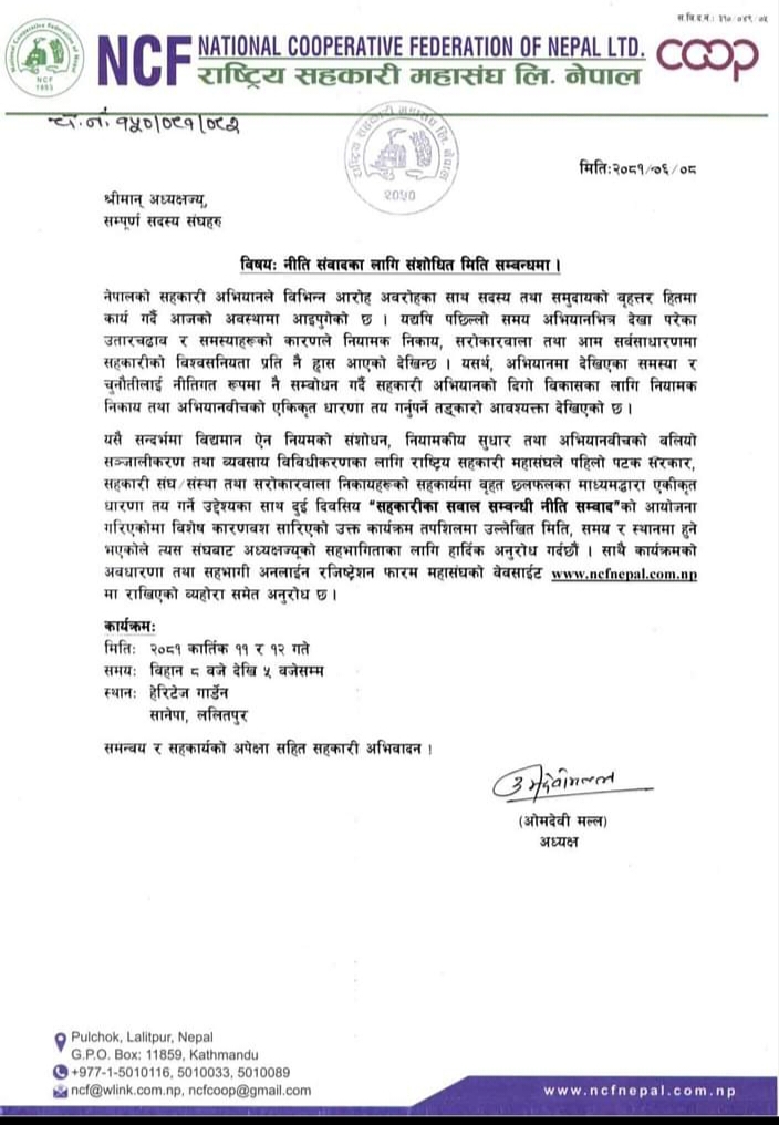 राष्ट्रिय सहकारी महासंघ लि.,नेपालले भर्खरैको प्राकृतिक विपदबाट पीडितहरुको राहत कार्यमा लाग्न सहकारी संघ संस्थाहरु लगायतलाई आह्वान गरेको छ । उक्त महासंघकी अध्यक्ष ओमदेवी मल्लले आइतबार प्रेस विज्ञप्ति जारी गरि सो आह्वान गर्नु भएकोहो ।