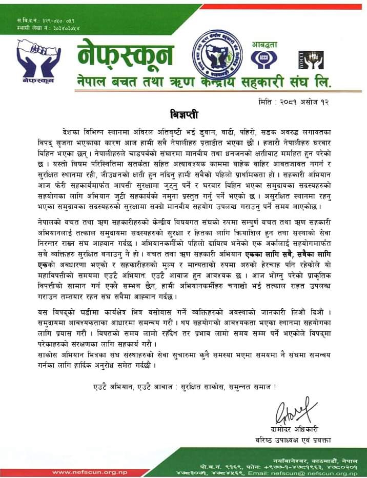 यसैगरी नेफ्स्कून,बारा जिल्ला बचत तथा ऋण सहकारी संघ लि. लगायतले पनि प्राकृतिक विपदबाट पीडित नागरिकहरुको राहत लगायतका कार्यमा लाग्न अपिल गरेका छन् ।