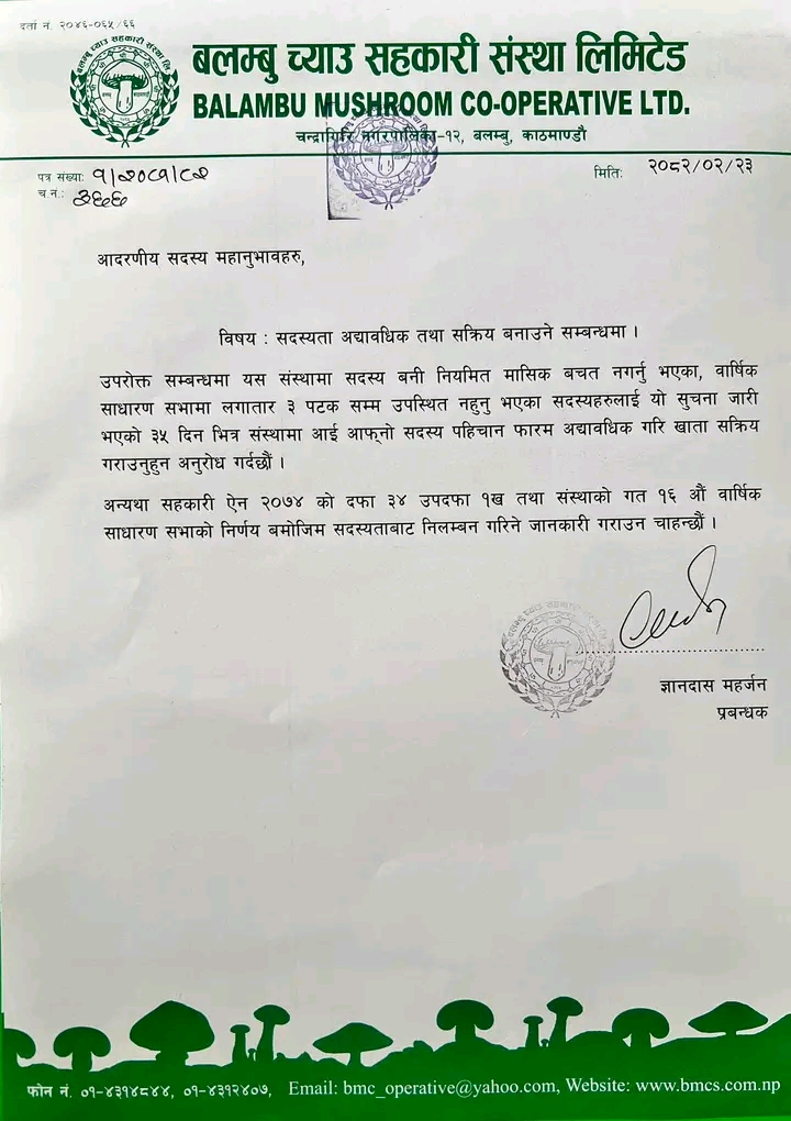 काठमाडौंको चन्द्रागिरि नगरपालिका-१२, बलम्बुुमा केन्द्रीय कार्याालय रहेको बलम्बु च्याउ सहकारी संस्था लि.ले नियमित मासिक बचत नगरेका र लगातार ३ पटकसम्म वार्षिक साधारण सभामा उपस्थित नभएका आफ्ना सदस्यलाई ३५ दिनभित्र सदस्यता पहिचान फाराम भरी सदस्यता नवीकरण गर्न अनुरोध गरेको छ । अन्यथा सदस्यताबाट जिलम्वन गरिने बताइएको छ ।