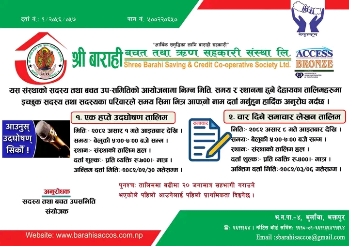 यता भक्तपुर नगरपालिका-४, भुलाँचामा रहेको श्री बाराही बचत तथा ऋण सहकारी संस्था लि.ले आफनो तालिम हलमा २०८२ असार १ गते आइतबारदेखि (बेलुका ५:००-७:०० बजे) एक हप्ते उद्घोषण तालिम र २०८२ असार ८ गते आइतबारदेखि (केलुका ५:००-७०० बजे) ४ दिने समाचार लेखन तालिम आयोजना गर्ने भएको छ । तालिममा सहभागी हुन चाहनेले सम्बन्धित विषयको तालिम शुरु हुनुभन्दा दुई दिन अगाडिसम्ममा नाम दर्ता गर्न अनुरोध गरिएको छ ।