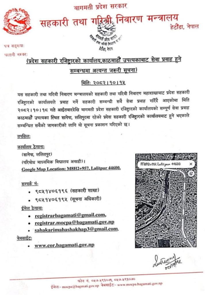 बागमती प्रदेश सहकारी रजिष्टारको कार्यालय हेटौंडाबाट ललितपुरको सानेपामा सरेको छ । आजबाट सो कार्यालयको काम ललितपुरको साानेपाबाट शुरु भएको छ तर कार्यालय व्यवस्थापनको काम भने चलिरहेको बताइएको छ । यस अघि हेटौडास्थित बागमती प्रदेश सहकारी महाशाखाबाट हुँदै आएको सबै काम आजबाट ललितपुरको सानेपास्थित बागमती प्रदेश सहकारी रजिष्टारको कार्यालयबाट शुरु भएको एक अधिकारीको भनाइ छ ।