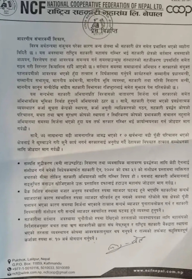 राष्ट्रिय सहकारी महासंघ लिमिटेड , नेपाल र नेपाल बहुउद्देश्यीय केन्द्रीय संघ लिमिटेडले सहकारीमा बचतको सीमा तोक्ने गरी ऐन शंसोधन गर्नु गलत भएको भन्दै त्यसको विरोध गरेका छन् । उनीहरुले प्रेस विज्ञप्ति जारी गर्दै त्यसो गर्न नहुनेमा जोड दिएका छन् । राष्ट्रिय सहकारी महासंघ लि., नेपालले सहकारी सन्दर्भ व्याजदर अव्यवहारिक भएको भन्दै त्यसको सट्टा स्वचालित व्याजदर कायम गर्न माग गरेको छ ।