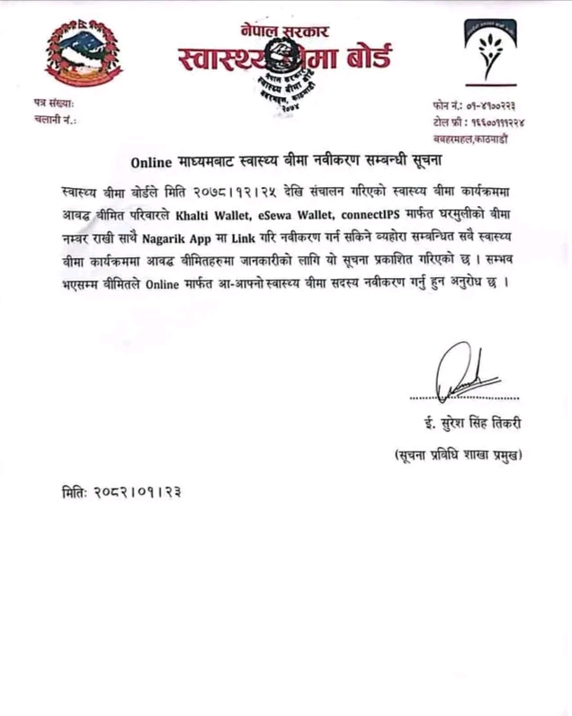 स्वास्थ्य बीमा बोर्डले २०७८ सालबाट शुरु भएको स्वास्थ्य बीमा बीमितले अनलाइनबाट नवीकरण गर्न सकिने भएको छ । स्वास्थ्य बीमा बोर्डले आज जारी गरेको सूचनामा सो कुरा उल्लेख छ ।