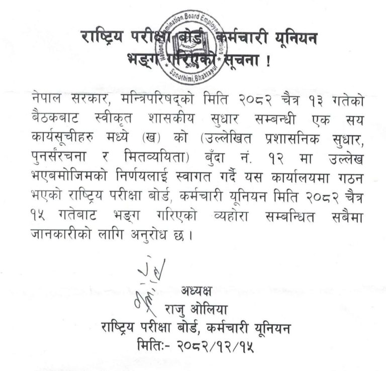राष्ट्रिय परीक्षा बोर्ड कर्मचारी यूनियन आजबाट भंग भएको छ । सो यूनियनका अध्यक्ष राजु ओलियाद्वारा हस्ताक्षर गरि जारी गरिऐको सूचनामा सो कुरा उल्लेख छ ।