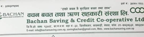 काठमाडौंको डिल्लीबजारमा रहेको वचन बचत तथा ऋण सहकारी संस्था लि.ले सहकारी ऐन,२०७४, सहकारी नियमावली,२०७५ र संस्थाको विनियम अनुसार आर्थिक वर्ष २०७८/०७९ को संरक्षित पूँजी कोषमा छुट्याएको रकम शेयर सदस्यहरुको खाता पठाएको सोही संस्थाका प्रबन्ध निर्देशक डा. देशमर्दन बस्न्यातले अलगपथलाई बताउनुभयो…