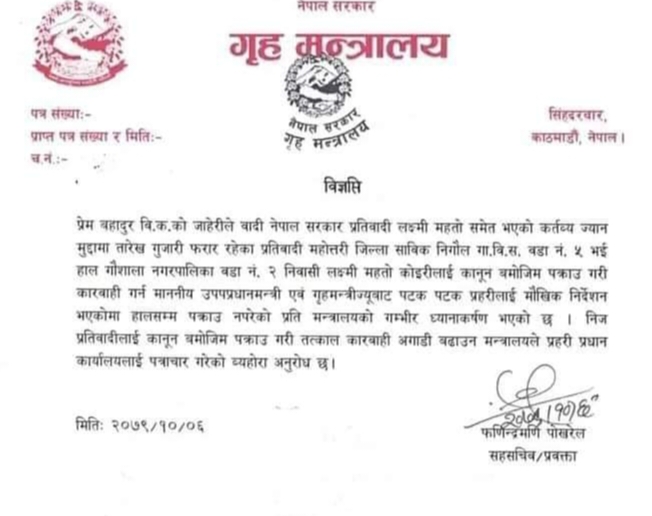 लक्ष्मी महतो कोइरीलाई पक्राउ गर्न गृह मन्त्रालयको प्रहरीलाई निर्देशन